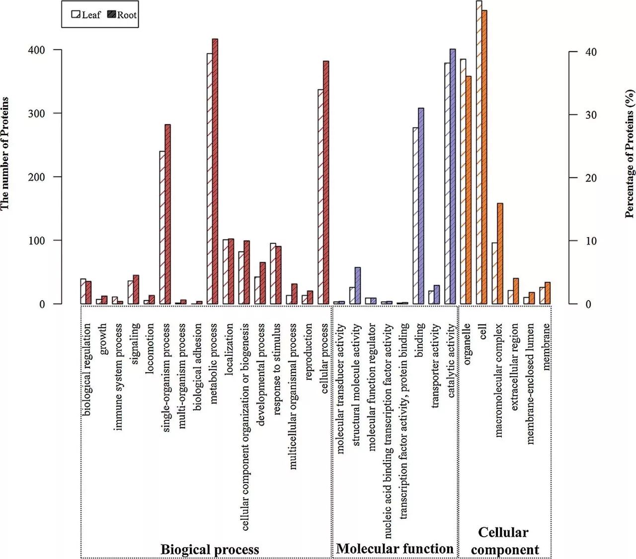 3. 差异表达蛋白的鉴定和分类:在生物学过程(BP),分子功能(MF)和细胞组分(CC)三个方面对差异表达的蛋白进行GO功能注释(fig3),从图中可以看出根和叶中差异蛋白的功能是相似的,它们主要参与了代谢过程,细胞过程和催化结合活性等功能。同时对差异蛋白进行KEGG通路注释和富集分析,发现叶中的差异蛋白主要参与的KEGG通路包括ribosome, carbon metabolism, biosynthesis of amino acids, oxidativephosphorylation, spliceosome, protein processing in endoplasmic reticulum, andglycolysis(fig4);