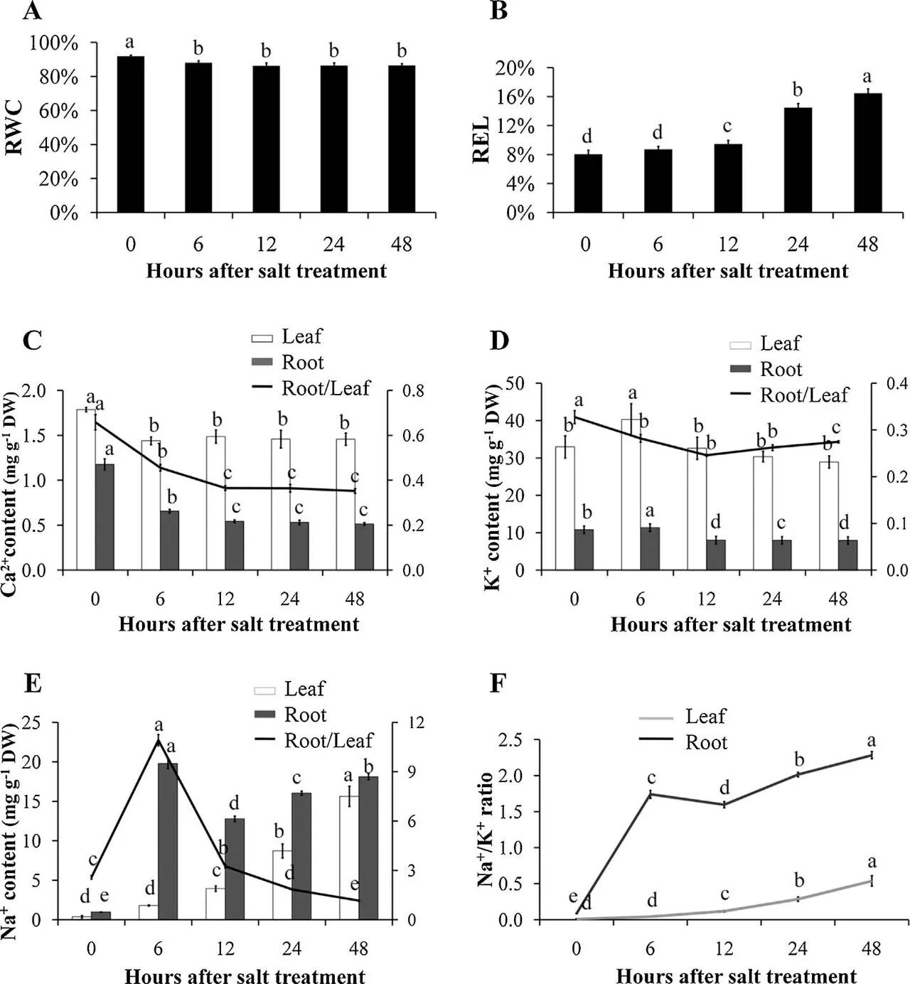 1. 白颖苔草盐胁迫不同时间后的生理反应:白颖苔草用300mM NaCl处理6h,12h,24h和48h后观察其相对水含量(RWC),相对电解质(REL),钙离子含量,钾离子含量和钠离子含量等生理指标,发现处理12h后这些生理指标均已经发生显著变化。