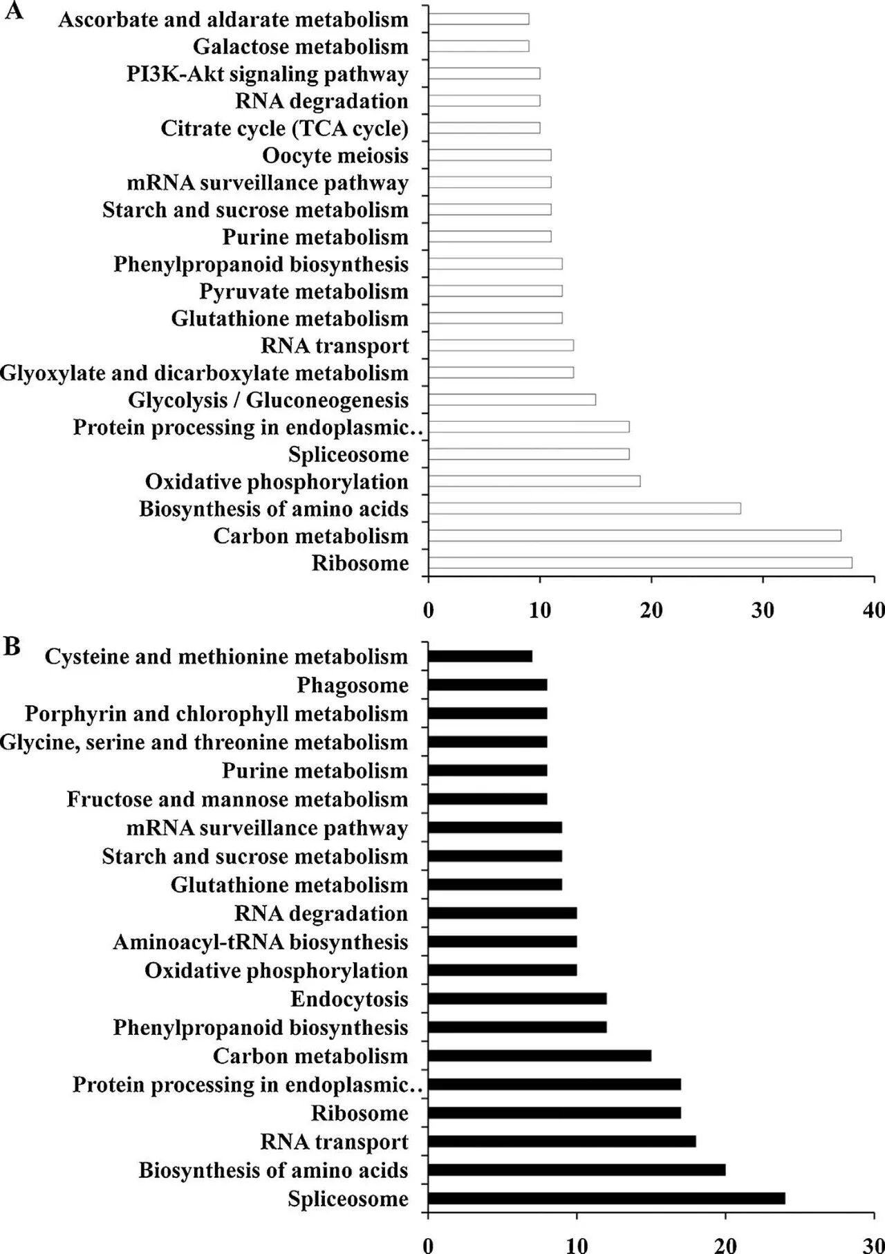 Fig. 4. KEGG pathway enrichment analysis of the DEPs detected in leaf (A) and root (B) in C. rigescens.