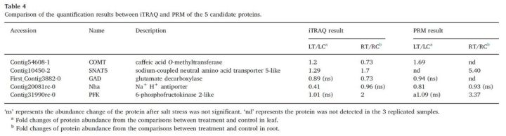 5. PRM验证关键蛋白的表达:从所有差异蛋白中挑选了5个有抗盐功能的蛋白进行PRM表达量的验证,发现5个差异蛋白的表达趋势与iTRAQ结果一致(下表),这证明这次iTRAQ组学结果在未来科学研究中是可信的。