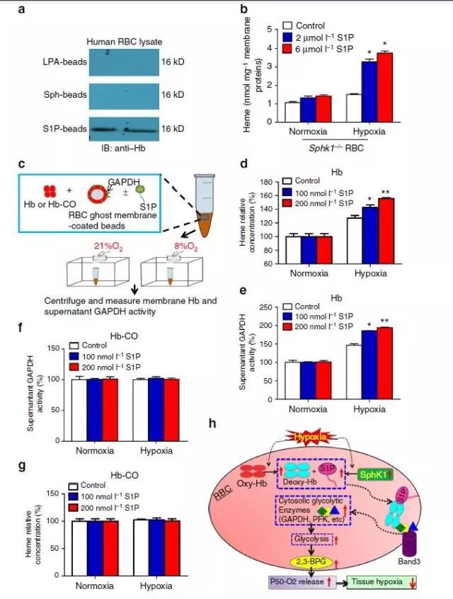 代谢流的实验证明低氧诱导时红细胞中的Sphk1可以使葡萄糖流向糖酵解途径。通过对糖酵解途径关键酶甘油磷酸脱氢酶(glyceraldehyde-3-phosphate dehydrogenase,GAPDH)定位与活性检测试验,以及SIP与GAPDH互作研究,最终解析了一个完整的调控过程:血细胞内SIP会促进去氧血红蛋白附着与膜上,同时释放膜结合的糖酵解酶,增强糖酵解过程生成2,3-BPG,进而促进红细胞的氧释放。