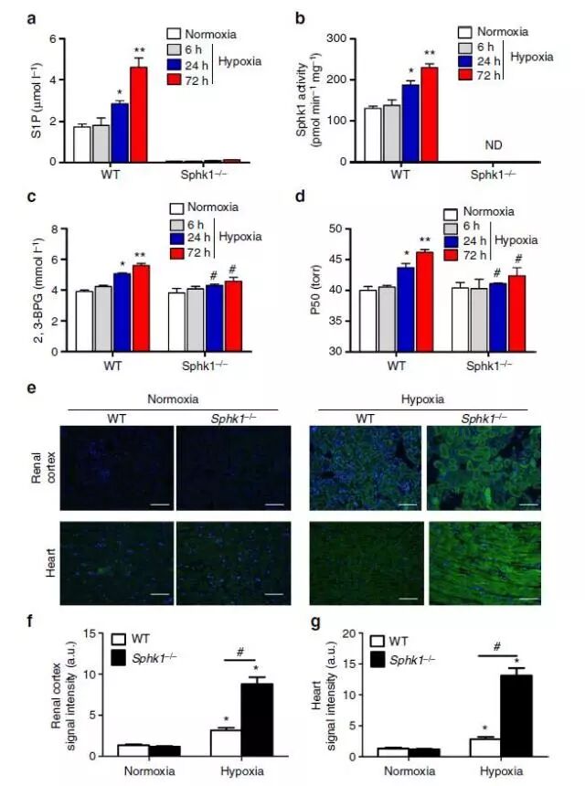 为了发掘上述人体实验结果所隐含的分子机理,作者在小鼠体内进行了一系列的深入研究:构建Sphk1突变小鼠,低氧实验发现,野生型小鼠与人体实验一致,氧释放增强,SIP,2,3-BPG含量增加,且Sphk1活性增强;突变小鼠却没有这些变化。并通过小鼠间的骨髓移植实验,证实脊髓来源红细胞中的Sphk1调控了低氧胁迫的氧释放。